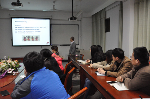 报告开始,主持人王笑老师对Fulai Liu副教授的到来表达了热烈的欢迎,紧接着对他的工作和科研做了简单的介绍。Fulai Liu 副教授于2000年获德国汉诺威大学园艺科学系农学硕士,2004年获得丹麦皇家兽医农业大学农学博士。1996-1998年在中国农业科学院土壤与肥料研究所担任助理研究员,2000-2001年在德国汉诺威大学园艺科学系担任研究助理。2004年起在丹麦哥本哈根大学任助理教授、副教授。Fulai Liu 主要在作物逆境生理及特别在干旱胁迫诱导的根源化学信号对作物营养与生殖发育的调控、作物响应气候变化等领域开展研究、碳水化合物代谢及水分利用效率的影响等方面进行了系统的研究。Fulai Liu 作为主要研究人员主持或参加欧盟合作项目、丹麦科学研究基金会项目十余项,是丹麦哥本哈根大学博士学位委员会主席、吉林大学兼职教授、 厂长资源 客座教授、中科院东北农林研究院兼职研究员。Fulai Liu博士还是中丹联合大学(丹麦政府与中国科学院合作办学,以联合培养两国研究生为主)的协调人和主要负责人。