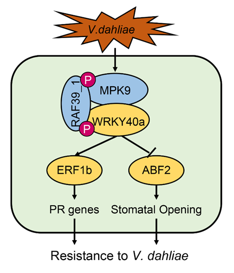 该研究针对团队前期发掘的抗病候选基因GhMPK9开展了系统的功能和分子网络分析。通过创制GhMPK9过量表达和RNA干扰的转基因棉花株系,发现GhMPK9 在调控棉花黄萎病抗性和棉花生长发育中均扮演关键角色。过量表达GhMPK9显著提高棉花抗病性,而沉默GhMPK9的棉花植株表现为生殖生长被严重影响,无法产生后代。磷酸化蛋白组和转录组分析发现RAF-like蛋白激酶GhRAF39_1和WRKY转录因子GhWRKY40a是GhMPK9下游底物,并通过酵母双杂交、双分子荧光互补、Pull-down、荧光素酶互补、体外磷酸化等实验证明GhMPK9-GhRAF39_1-GhWRKY40a分子模块磷酸化激活关系。GhMPK9不能直接磷酸化GhWRKY40a,GhRAF39_1也不能单独磷酸化GhWRKY40a,而GhMPK9和GhRAF39_1共同孵育则可以磷酸化GhWRKY40a,表明GhRAF39_1作为GhMPK9的新型磷酸化底物介导了其对GhWRKY40a的磷酸化激活过程。黄萎病菌侵染后植株表型观察、植株病情指数统计等研究发现,沉默GhMPK9、GhRAF39_1和GhWRKY40a均降低了棉花对黄萎病的抗性。基于转录组联合分析进一步发掘到乙烯响应因子GhERF1b和脱落酸响应因子GhABF2为GhWRKY40a调控的下游关键靶基因。酵母单杂、LUC/REN双荧光素酶和凝胶迁移实验均表明GhWRKY40a能够直接结合GhERF1b和GhABF2的启动子,GhMPK9-GhRAF39_1-GhWRKY40a的级联磷酸化促进了GhERF1b表达但抑制GhABF2的表达。此外,沉默GhERF1b显著抑制PR基因表达进而降低棉花对黄萎病的抗性,而沉默GhABF2则通过促进气孔开放,有助于降低植株体内温度和湿度,进而提高了棉花对黄萎病的抗性。综上所述,该研究解析了GhMPK9-GhRAF39_1-GhWRKY40a复合体通过调控GhERF1b介导的乙烯通路和GhABF2介导的ABA通路,促进棉花抗黄萎病的分子网络。该研究加深了对棉花抗黄萎病分子机制的理解,为培育棉花抗病新品种提供了理论基础和基因资源。