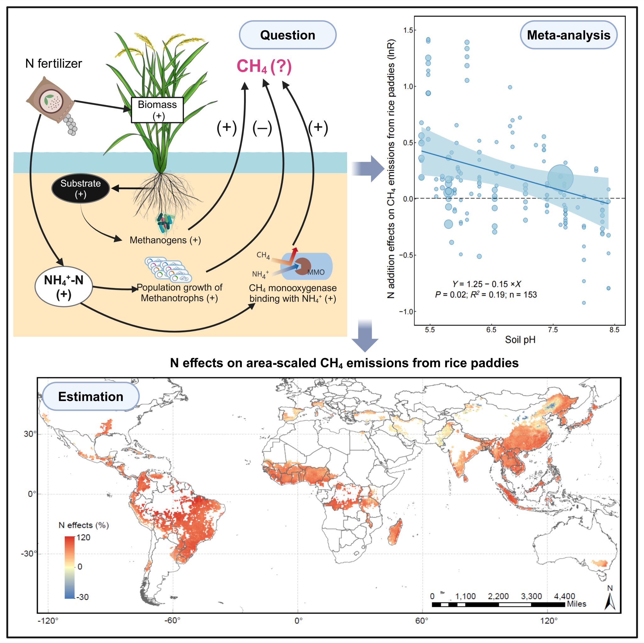 氮肥是影响粮食产量和温室气体排放的重要因素。然而,氮肥施用对稻田甲烷(CH4)排放的效应依旧扑朔迷离,即正效应、负效应或无影响都常被报道,这严重影响了稻田CH4排放预测的准确性和稻田减排策略的制定。 厂长资源 丁艳锋教授团队联合国内外优势团队发现,稻田CH4排放对施氮的响应受土壤pH调控,即施氮对稻田CH4的影响随着土壤pH的增加而降低。相关研究成果以“Soil pH determines nitrogen effects on methane emissions from rice paddies”在线发表在《Global Change Biology》上。