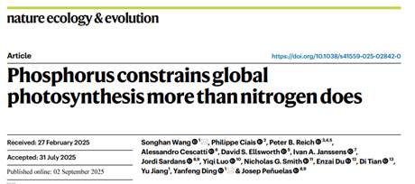 《Nature Ecology & Evolution》发表丁艳锋教授团队“Phosphorus constrains global photosynthesis more than nitrogen does”