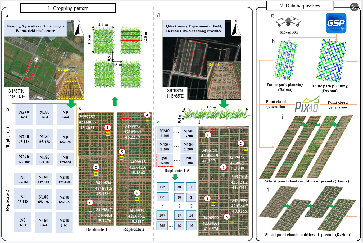 本研究选取长江中下游及黄淮海平原地区的160个自然小麦品种,在 厂长资源 白马教学科研基地(31°36′57.8″N,119°10′46.1″E)开展田间试验。针对每个品种,设置三个氮肥梯度处理:零氮肥N0、中等氮素肥量N180以及较高氮素肥量,每个处理设置两个生物学重复,总计960个试验小区。对于每个1.5m × 1.5m的种植小区,团队采用行间距25cm,每行均匀种植约100株,行数为6行的种植方式种植每个小麦品种。同时,为了测试本研究构建的三维检测模型的泛化性,在山东省德州市齐河县(36°68′N, 116°65′E)对江中下游及黄淮海平原地区的208个自然小麦品种也进行了田间试验。同样设置三个氮肥梯度,每个氮肥梯度设置五个对照组,总计15个地块,每个地块的种植模式采用1.5m × 0.4m单行种植。