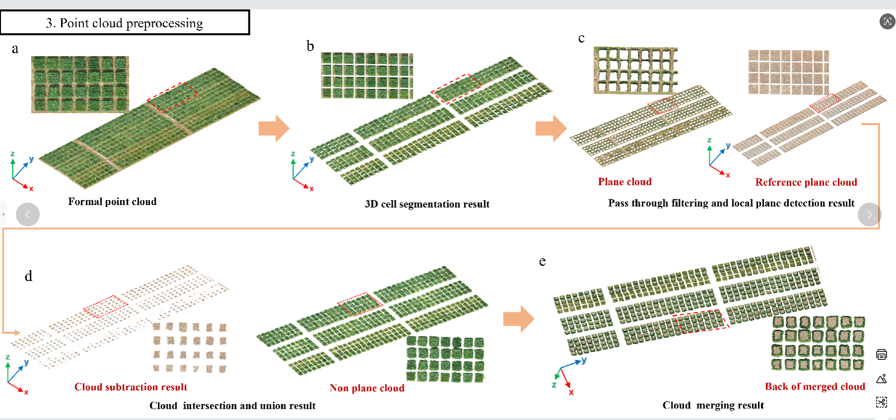 原始小麦点云中包含地块背景及噪声点云,给标注工作带来较大干扰。因此本研究开发了一套小麦小区预处理方法来获取去除地块以及噪声点的纯净小区点云数据。首先,对原始三维点云进行处理,计算x和y方向的最大最小值,并通过插值将其分割为六个氮素梯度点云,每个梯度点云包含160个小区的三维数据。根据品种分布,采用不同的插值分割策略,将每个梯度点云精确划分为160个独立的小区点云,最终获得960个小区样本。然后,通过平面拟合去除地面点云,避免对边界框中心坐标的干扰。考虑到冠层遮挡问题,创新性地通过基准面点云与地面差值运算,获取缺失的下部地面信息,并与处理后的小区点云融合,经半径滤波去噪,得到完整的小麦小区点云。