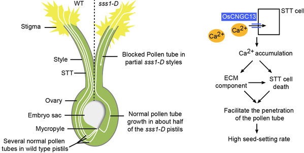 万建民院士课题组研究人员从籼稻9311 60Co辐射诱变突变体库中获得一个结实率约50%的显性突变体semi-seed-setting rate1-Dominant (sss1-D)。细胞学观察表明,突变体sss1-D表现雌性不育,但雌、雄配子等均发育正常,低结实率的原因在于花粉管在花柱中不能正常生长。图位克隆表明,SSS1-D编码一个细胞膜定位的环核苷酸门控通道蛋白(Cyclic Nucleotide-Gated Channel 13, OsCNGC13),主要在花柱中优势表达。电生理实验证实,该蛋白能够介导钙离子进入HEK293细胞;水稻中的功能分析表明,OsCNGC13通过促进授粉后花柱中钙离子的积累、花粉管通道基质(ECM)组分的决定以及STT细胞程序性死亡(PCD)的正常进行,从而影响雌蕊孢子体组织对花粉管的引导,并最终有利于花粉管在花柱中的顺利生长和双受精的完成。