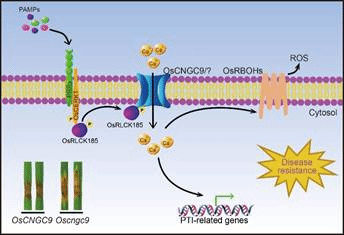 通过突变体鉴定、遗传分析和基因定位等方法,克隆获得水稻CDS1(CELL DEATH and SUSCEPTIBLE to BLAST1)基因编码的环核苷酸门控离子通道蛋白OsCNGC9,该基因对稻瘟病抗性具有正向的调控作用。OsCNGC9能够介导PAMP诱导的钙离子流,这对于PAMP触发的ROS爆发和PTI相关防御基因表达具有重要作用。进一步结果表明,PTI相关的类受体激酶OsRLCK185能够与OsCNGC9互作,并通过磷酸化修饰改变其通道活性。过表达OsCNGC9可显著提高水稻的PTI反应和苗期稻瘟病抗性,表明OsCNGC9在水稻抗病育种中具有重要应用价值。