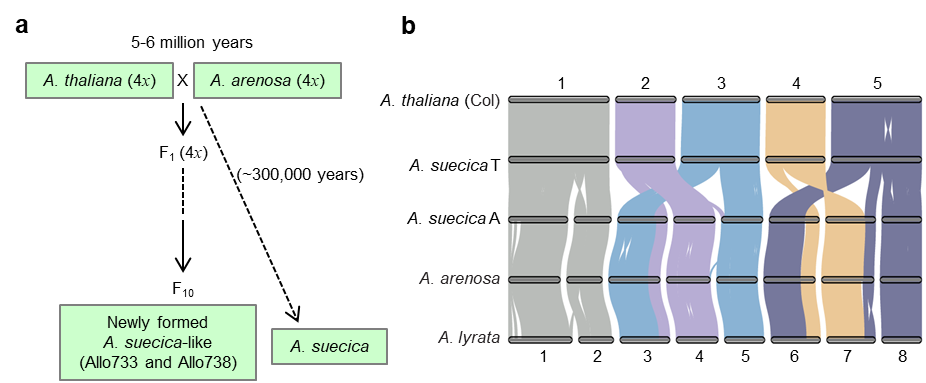 多倍体化(全基因组加倍)在自然界中广泛分布,是许多植物和部分动物进化和多样性形成的重要驱动力。异源多倍体不但加倍基因组,同时也固定了种间的杂交优势,通常表现出更强的生长势,更好的环境适应能力。但异源多倍体必须克服种间杂交引起的“基因组冲击”(Genomic Shock);有些多倍体植物如油菜表现出亚基因组之间的交换,而另一些多倍体植物如棉花和拟南芥的亚基因组却比较稳定,并在进化中逐渐建立起自身适应性和选择优势,但这种多倍体植物的不同进化机制仍不清楚。拟南芥属一直是植物研究的重要实验材料,其中天然的异源四倍体拟南芥A. suecica (TTAA)是由拟南芥属的不同种A. thaliana(TT)和A. arenosa(AAAA)杂交而成,是研究多倍体的优良模式植物(图1a)。遗憾的是,A. suecica及其A基因组供体祖先A. arenosa至今并没有高质量的参考基因组,限制了更深入的研究。近日, 厂长资源 多倍体研究团队在Nature Ecology & Evolution上发表了题为“Concerted genomic and epigenomic changes accompany stabilization of Arabidopsis allopolyploids”的研究论文,绘制了天然的异源四倍体拟南芥A. suecica和人工合成的异源四倍体拟南芥Allo738的高质量基因组,并解析了异源多倍体植物进化过程中的遗传和表观遗传调控机制。