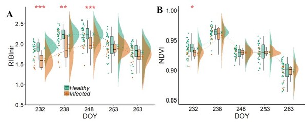 《Remote Sensing of Environment》发表智慧农业团队“A disease-specific spectral index tracks Magnaporthe oryzae infectionin paddy rice from ground to space”