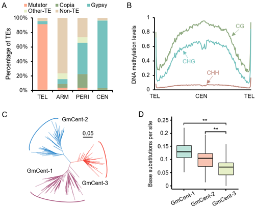 对大豆端粒和着丝粒的研究发现,超过95%的端粒和着丝粒区域由转座子组成。其中,超过90%的着丝粒序列为Gypsy逆转录转座子,而90%以上的端粒序列为Mutator DNA转座子(图2A)。与之相对应的,着丝粒和端粒区域均呈现较高的DNA甲基化水平(图2B)。真核生物的着丝粒由重复序列组成,基于从头预测,该研究鉴定到大豆13号染色体着丝粒特异的未发表过的重复序列GmCent-3。相比于已知的GmCent-1和GmCent-2, GmCent-3序列间变异更小,表明13号染色体的着丝粒形成可能晚于其他染色体(图2C,D)。