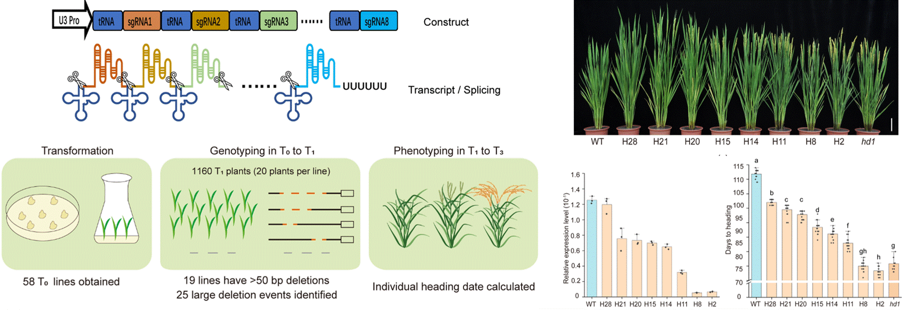 通过基因编辑改变品种抽穗期是扩大品种适宜区域的重要途径,然而主效抽穗期基因的效应太大,通过基因敲除往往产生20-30天的抽穗期改变,同时伴随株高等农艺性状的严重变化,无法实现抽穗期的精细调控,因而育种利用价值有限。针对该问题,本研究开发的HMP技术通过sgRNA和tRNA的串联,同时靶向单个基因启动子区域的多个靶点,能够在靶基因的顺式调控区域产生点突变、插入、缺失等不同的变异,特别是在不同靶点间产生大片段缺失的效率很高,可以不同程度的改变目标基因的表达量,这为通过基因组编辑产生启动子区域变异,精细调节重要农艺性状提供了一种高效的途径。