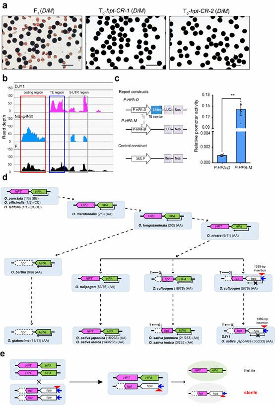 该研究以南方野生稻(Oryza meridionalis. Mer)为材料,构建了以亚洲栽培稻滇粳优1号(DJY1)背景仅在第一染色体上含有野生稻片段的近等基因系(NIL-qHMS1),该NIL植株和花器官形态与DJY1相似,花粉完全可育,但DJY1和NIL-qHMS1的杂种F1花粉呈半不育表型,败育时间发生单核花粉期。通过图位克隆和转基因验证,发现第一染色体上连锁的两个基因ORF3/ HPT(编码解旋酶亚家族)和ORF5/ HPA(编码F-box蛋白)分别发挥毒药-解毒(toxin-antidote)功能,组成一个自私的遗传元件,选择性地败育DJY1基因型的花粉;分析发现,DJY1中HPA因转座子插入其启动子而不表达,HPT基因编码区,因单碱基替换导致蛋白翻译提前终止,进而导致该遗传元件功能丧失;HPT基因可能通过影响淀粉合成相关基因的表达来调控花粉粒的发育。进化分析表明HPT-HPA连锁位点是一个新进化形成的位点,且HPT的分化要早于HPA。