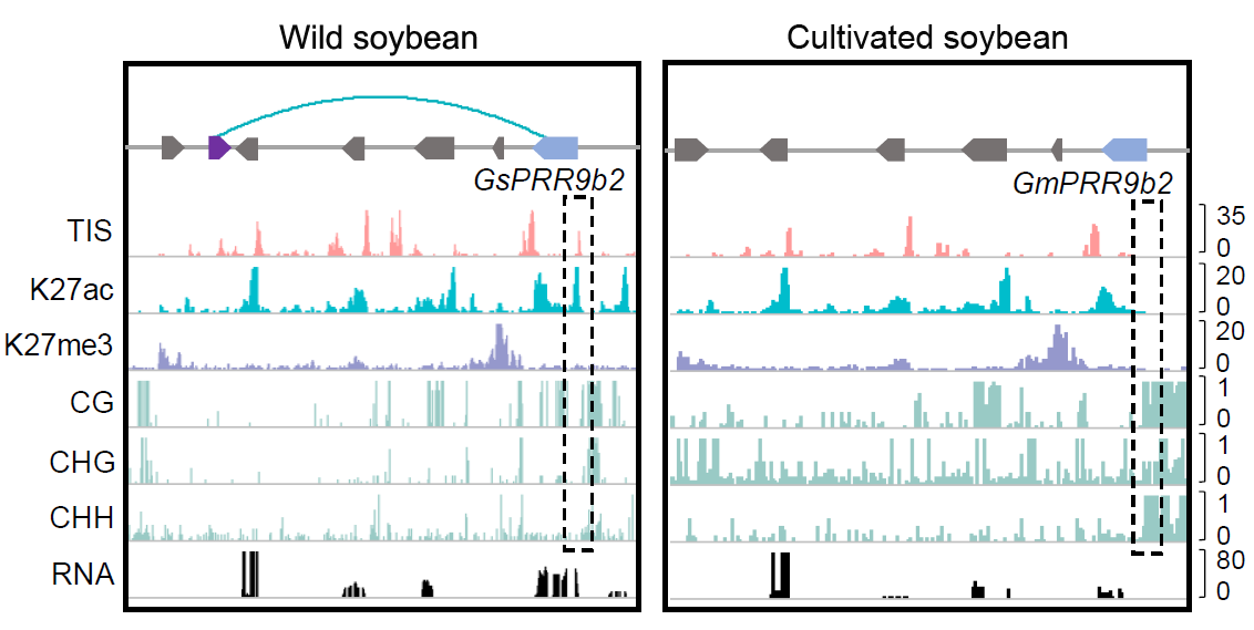 基因组多倍化(全基因组复制)是物种形成和进化的重要驱动力,在自然界中广泛存在。大豆(Glycine max)是典型的古多倍体,其祖先与菜豆(Phaseolus vulgaris)祖先分化后,又经历一次全基因组多倍化并伴随着缓慢的二倍化过程,导致近75%的基因以多拷贝形式存在。在约6000-9000年前的东亚地区,野生大豆被驯化为栽培大豆,其农艺性状发生显著改变。然而,在大豆多倍化、进化和驯化过程中,表观遗传在调控基因表达和重要农艺性状中的作用仍然知之甚少。