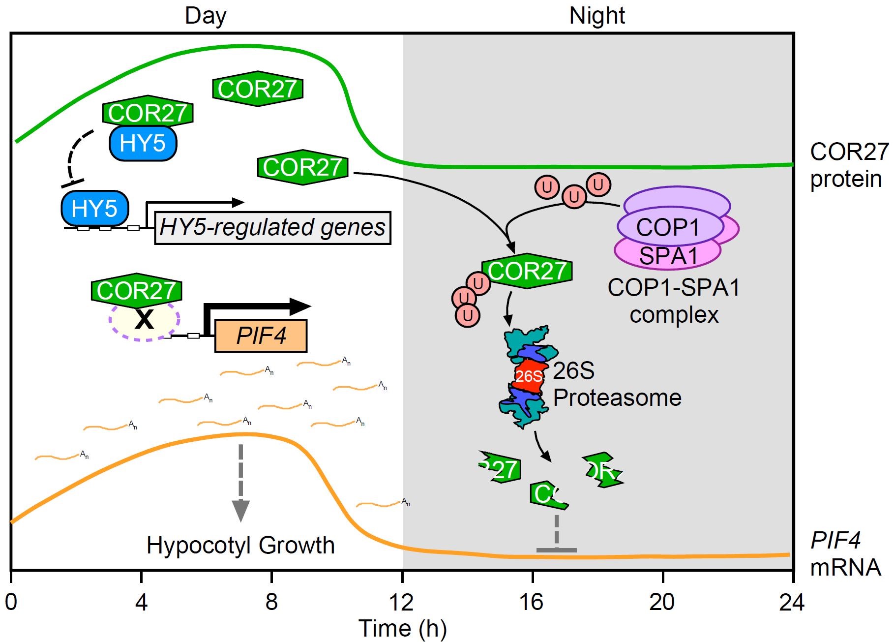 在植物的光信号转导过程中,COP1-SPA蛋白复合体是光信号转导通路中的核心抑制子,作为E3泛素连接酶介导下游靶蛋白降解。bZIP类型的转录因子HY5是植物光信号转导的正向调控因子,而bHLH类型的转录因子PIF4是植物光信号转导的负向调控因子,它们协同调控植物信号转导过程。本项研究鉴定发现,COR27作为植物光形态建成的负向调节因子,能够整合光信号和生物钟节律,进而调控植物的生长发育。在白天光照时,COR27蛋白不断表达积累,积累的COR27蛋白能够与转录因子HY5发生相互作用,抑制了HY5的DNA结合活性;另一方面,COR27作为转录调节因子,能够结合PIF4的启动子区域,在下午促进PIF4及其下游靶基因的转录表达,最终促进了植物下胚轴的生长。在晚上黑暗时,COR27蛋白能够与COP1-SPA1蛋白复合体发生相互作用,导致COR27被泛素化并被26S蛋白酶体所降解。该项研究揭示了COR27整合光信号和生物钟节律协同调控植物光形态建成的工作机制(图1)。