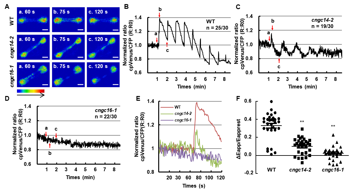 细胞质中钙离子浓度的瞬时上升一直被认为是植物温度胁迫反应的早期核心事件之一。但水稻中负责介导这一过程的钙离子通道仍然未知。通过CRISPR/Cas9基因编辑技术我们产生了编码环核苷酸门控离子通道蛋白基因OsCNGC14和OsCNGC16的突变体。温度胁迫处理发现OsCNGC14和OsCNGC16对水稻的耐热性和耐冷性均具有正调控作用。OsCNGC14和OsCNGC16在温度胁迫诱导的细胞质钙离子内流调控方面发挥重要作用,OsCNGC14和OsCNGC16基因突变会显著降低或消除温度胁迫诱导的细胞质钙离子内流。本研究建立了一条从温度胁迫信号识别到钙离子通道激活的植物温敏信号传导途径,揭示了环核苷酸门控离子通道蛋白OsCNGC14和OsCNGC16在介导细胞质钙离子升高和水稻温敏中的作用,为水稻耐高温和低温育种提供了基因资源和理论基础。