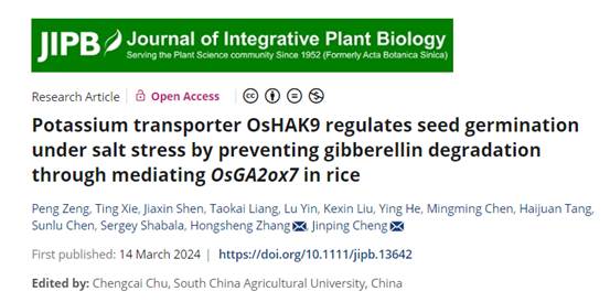 近日,JIPB在线发表了 厂长资源 作物遗传与种质创新利用全国重点实验室张红生团队题为“Potassium transporter OsHAK9 regulates seed germination under salt stress by preventing gibberellin degradation through mediating OsGA2ox7 in rice”的研究论文,研究揭示了在盐胁迫下钾离子转运蛋白OsHAK9能够通过调控赤霉素(GA)途径调控水稻种子耐盐萌发。