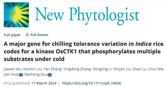 《New Phytologist》发表植物环境适应分子遗传研究课题组“A major gene for chilling tolerance variation in Indica rice codes for a kinase OsCTK1 that phosphorylates multiple substrates under cold”