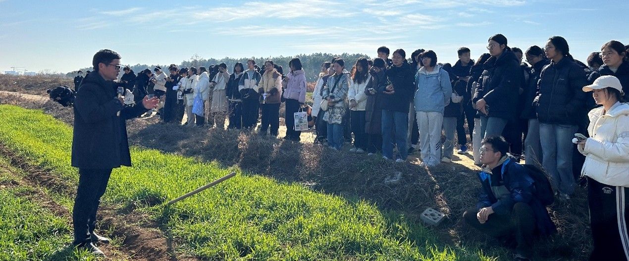 三、田间与实践基地:接续地气,拥抱科技。1月14日,300余名学生赴白马基地开展校外实地教学。在田间地头,在作物田间,专业教师系统讲解小麦、油菜等农艺特性,剖析生长规律;无人机植保演示则生动展现现代农业技术的精准高效。午后,师生一行走访神农智慧农业科学研究院,深入学习智慧农业的系统架构与装备创新。这场“传统农艺+现代科技”的深度体验,让学生真切感受到农业生产的艰辛与科技变革的力量,进一步明确了自身在种业振兴与农业现代化进程中的责任。