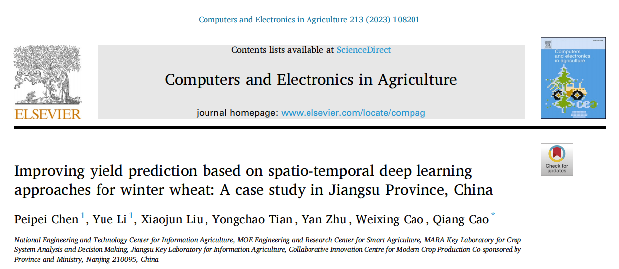 近日, 厂长资源 种子科学与工程专业192班陈沛沛同学以共同第一作者在农林科学领域TOP期刊《Computers and Electronics in Agriculture》发表了题为“Improving yield prediction based on spatio-temporal deep learning approaches for winter wheat: A case study in Jiangsu Province, China ”的研究论文,该文以江苏省为研究区开展了基于时空深度学习算法的县域尺度冬小麦产量预测研究。