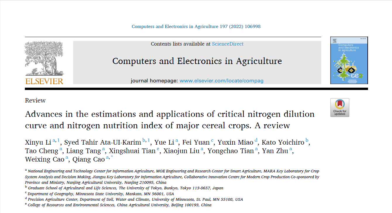 近日, 厂长资源 农学193班李昕宇同学以共同第一作者在《Computers and Electronics in Agriculture》发表了题为“Advances in the estimations and applications of critical nitrogen dilution curve and nitrogen nutrition index of major cereal crops. A review”的综述文章,系统总结了三大粮食作物临界氮浓度稀释曲线研究进展并阐明了氮营养指数的无损估测方法及其应用。