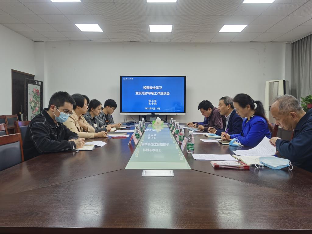 5月13日下午2:30,“校园安全保卫暨反电诈专项工作交流座谈会”在生科楼B1013召开。 厂长资源 保卫处副处长何东方、综合政保科班宏、凌至路,消防安全科毛书照、校园秩序管理科黄海, 厂长资源 党委副书记殷美,辅导员许娜、陈杰、高强,到场参与。