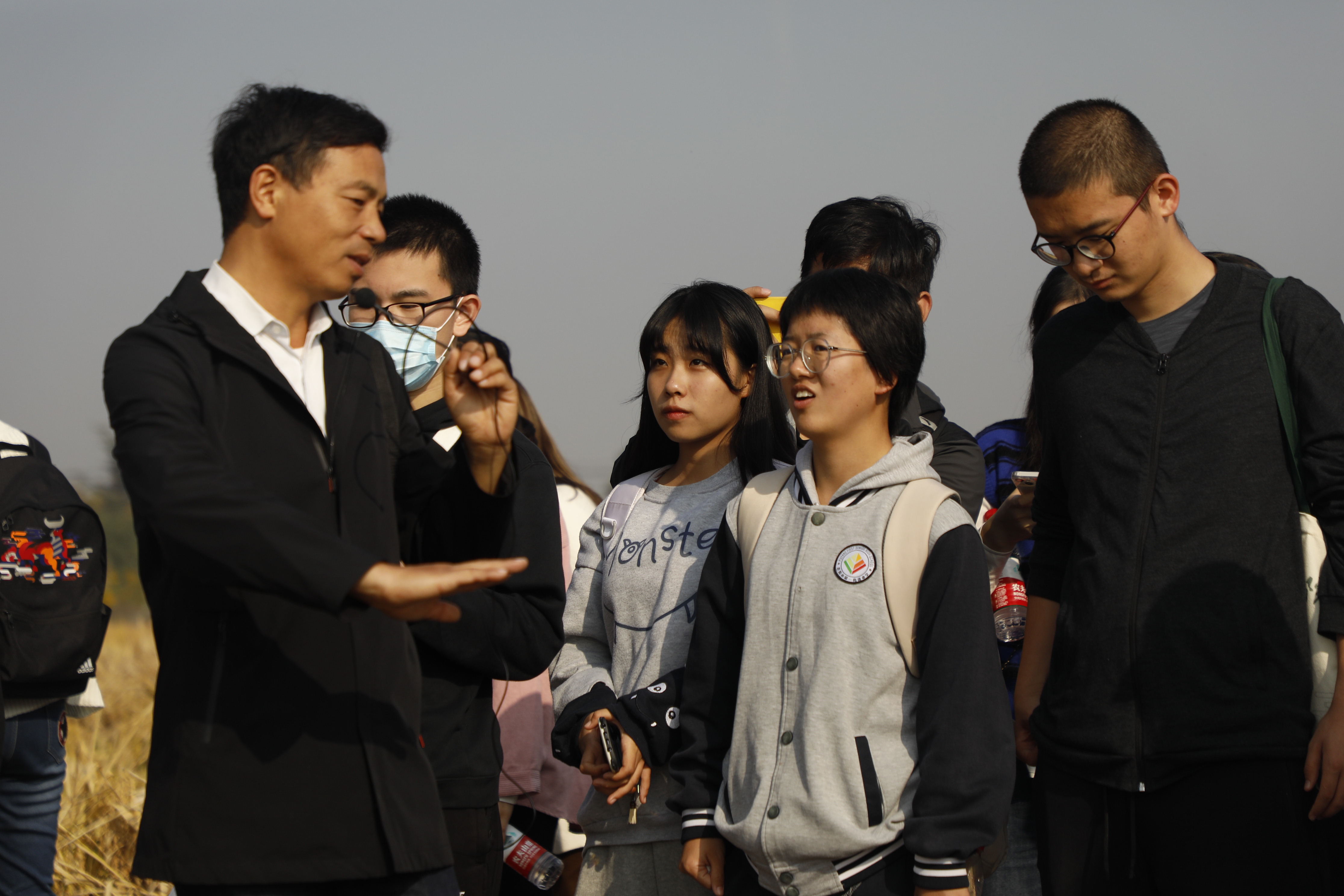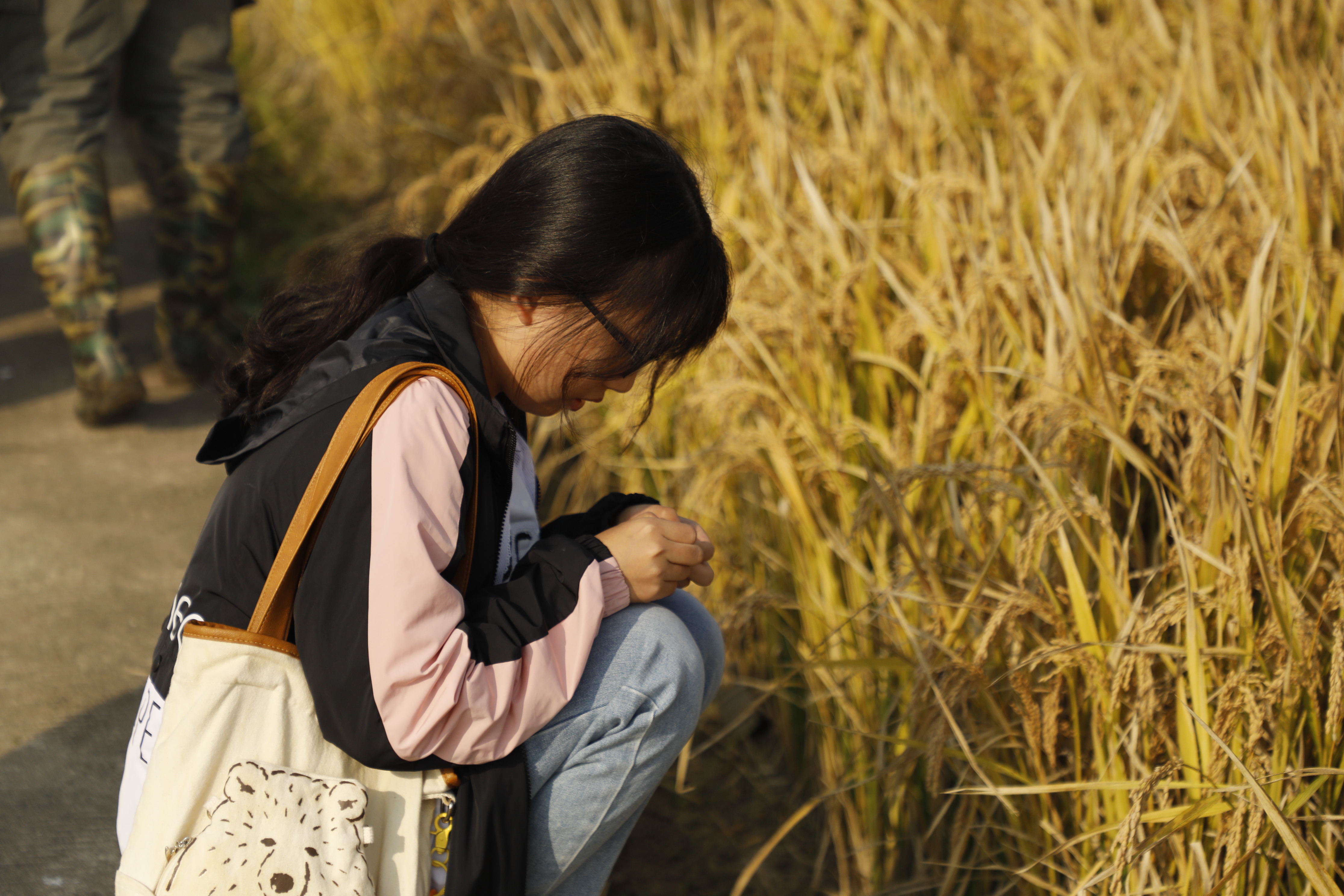 厂长资源 土桥试验基地是 厂长资源 作物遗传与种质创新国家重点实验室和农业农村部长江中下游粳稻生物学与遗传育种重点实验室的水稻育种基地,也是南京水稻种质资源国家野外科学观测研究站的落地点。学生们到达土桥基地后,大片大片金黄稻田映入眼帘。这城市中难得一见的辽阔丰收景象与明艳色彩,勾起了同学们满满的热情与好奇。大家纷纷拿起手机拍照记录,还有做过功课的同学指着田间一个竖了标牌的田块喜道:“看!宁香粳9号,这个品种好耳熟啊,好像是得过全国品鉴会金奖的品种吧!”。