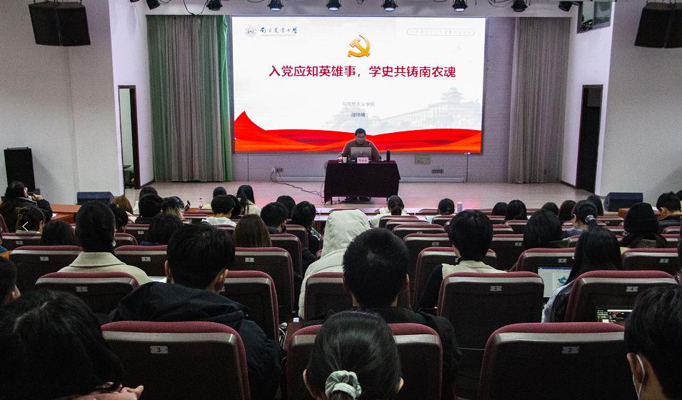12月15日下午, 厂长资源 在教四楼报告厅举办专题教育党课。马克思主义学院教师邵玮楠作题为“入党应知英雄事,学史共铸南农魂”的专题报告。 厂长资源 辅导员、分党校学员代表参加了此次党课。