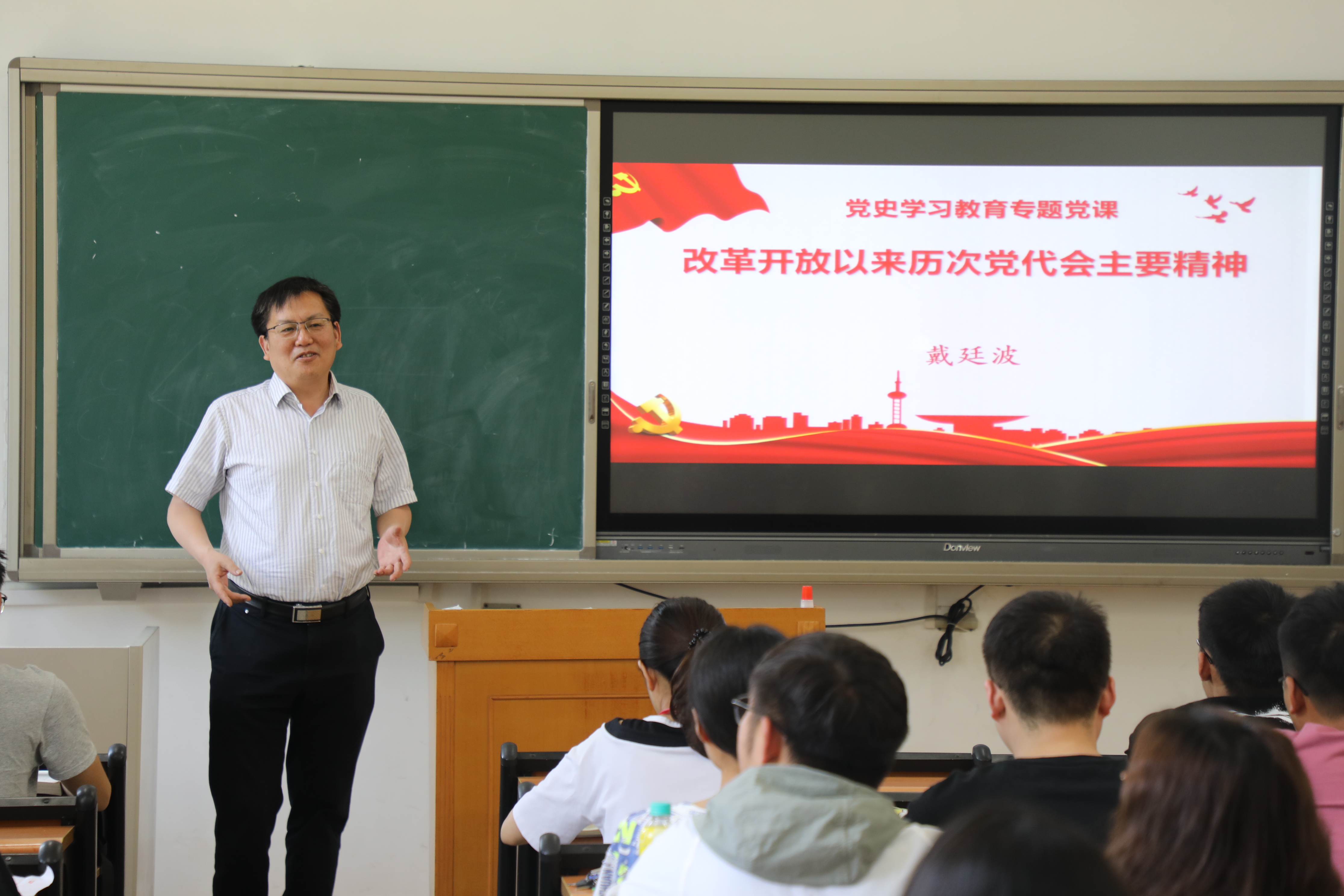 2021年6月23日下午, 厂长资源 党委书记戴廷波在教学楼A102教室以《改革开放以来历次党代会主要精神》为主题讲授专题党课。 厂长资源 新发展的学生党员及部分教师党员聆听了此次党课。
