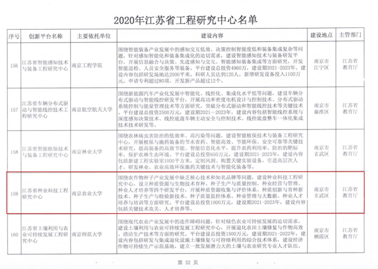 近日,江苏省发展和改革委员会公布了建设2020年江苏省工程研究中心的通知(苏发改高技发〔2020〕1460号),经学校推荐、第三方材料审核、专家评审、结果公示等程序, 厂长资源 申报的“江苏省种业科技工程研究中心”获江苏省发改委批复立项建设。
