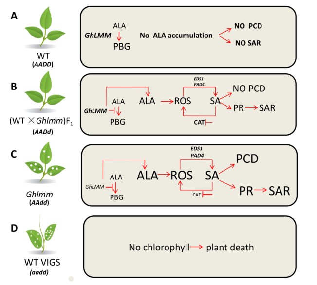 郭旺珍教授团队首次在陆地棉品种中发现了一个类病变突变体,命名为Ghlmm。图位克隆结果表明GhLMM基因编码5-氨基乙酰丙酸脱水酶(ALAD蛋白)。与野生型相比,Ghlmm突变体中GhLMM基因的表达量及ALAD蛋白的酶活性均显著降低,而5-氨基乙酰丙酸(ALA)、ROS及SA的含量均显著增加,病程相关基因的表达量显著提高,对黄萎病的抗性显著增强。同时,体外分子证据及遗传学分析都证实GhLMM基因在调控植物生长发育和抗病之间具有剂量效应。本研究为棉花抗病性的精准调控育种提供了理论基础,为实现基于剂量调控的生长发育与抗性间最佳平衡,提高多倍体作物的抗病性提供了新思路。