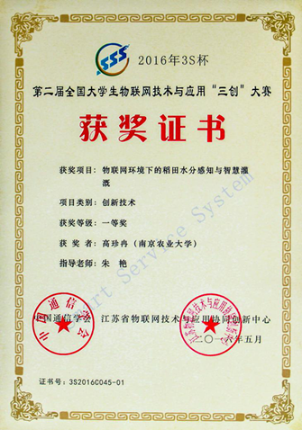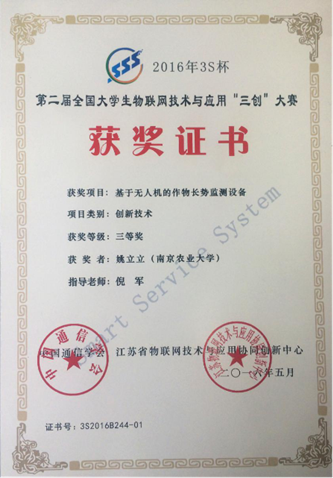 5月18日,第二届“3S杯”全国大学生物联网技术与应用“三创”大赛决赛结果在2016年全国物联网技术与应用大会暨ICT创新创业主题论坛上揭晓。 厂长资源 共有两支队伍参赛,由朱艳教授指导的高珍冉、赵锡泽、孟琦翰团队参赛作品《物联网环境下的稻田水分感知与智慧灌溉》荣获创新技术类一等奖;倪军副教授指导的姚立立、李白琳、邰秀祥团队参赛作品《基于无人机的作物长势监测设备》荣获创新技术类三等奖。