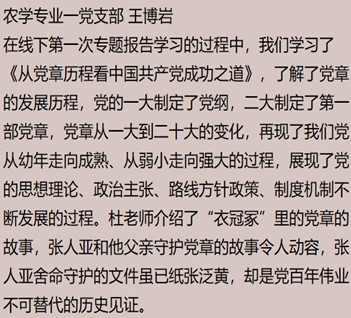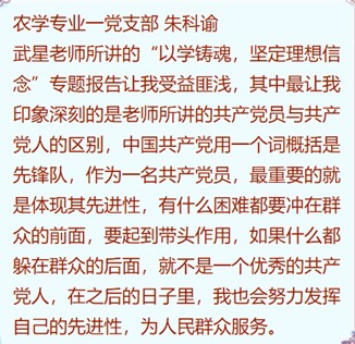 老师强调到:“理论学习是提升党性修养的法宝。各位党员同志应当坚持立场观点方法,做马克思主义的忠实实践者;作为农业大学的学生,应当在推进农业农村现代化的进程中贡献青春力量;始终牢记自己的身份角色,增强党员意识,勇于实践,争当表率。”