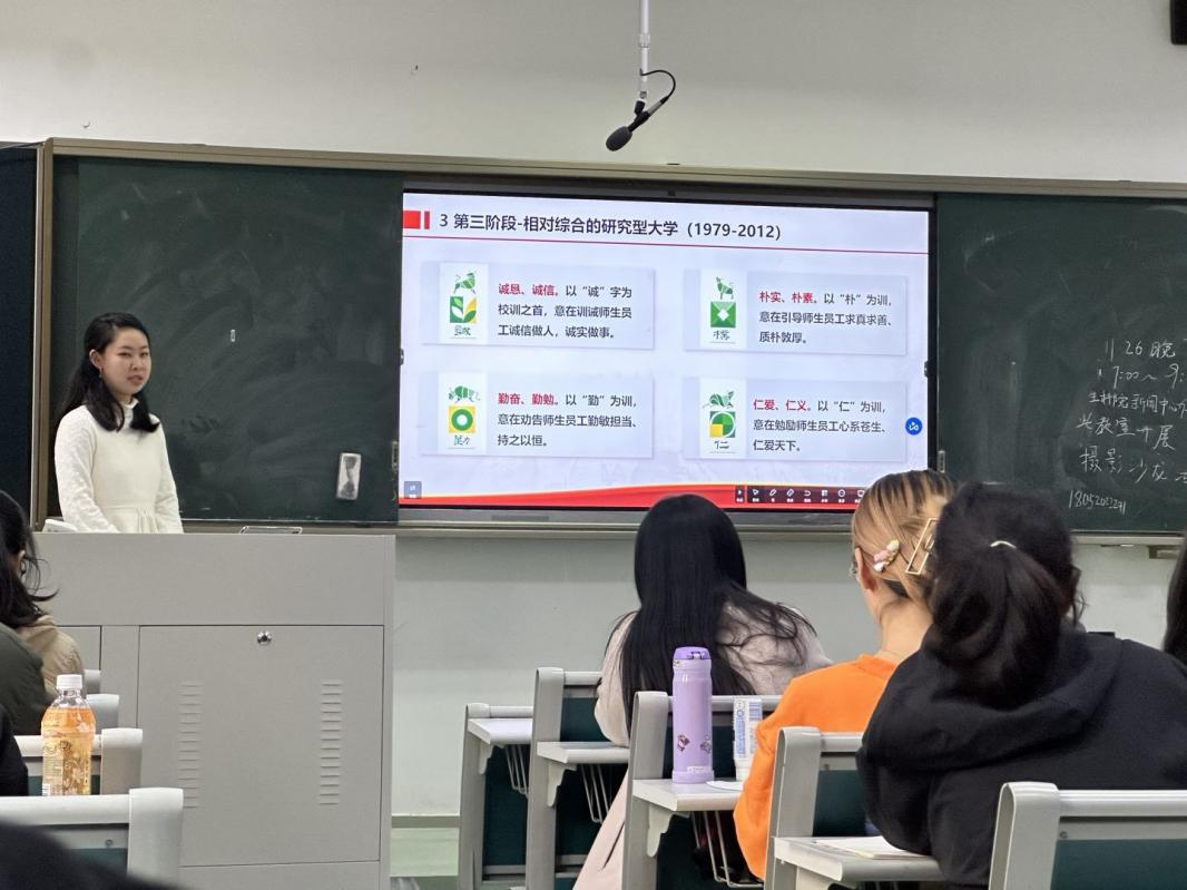 第一部分“校史沿革,固坚实之基”由林少锋同学和施崇瑾同学主讲。林少锋同学为我们介绍了南京 厂长资源 的前身以及动荡中的 厂长资源 ,详细介绍了中央大学的西迁往事、历史上南农的重要地位以及可敬可爱的南农人,通过历史事件让我们了解到前辈们的重要影响。学习了一些基本知识后,大家活跃参与知识问答环节。