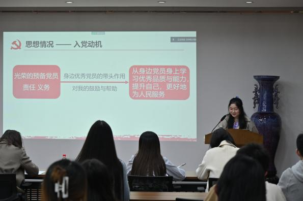 成长汇报分为两个部分:3分钟PPT成长展示环节和2分钟答辩提问环节。在PPT成长展示环节,各位预备党员介绍自己一年来入党动机、学习生活、志愿服务等方面的成长与变化,总结展示自己的收获和不足。答辩提问环节旨在进一步了解和考察各位预备党员的理论学习情况和预备期表现,老师和各支部书记就每个人的汇报提出针对性建议并指出改进方向。