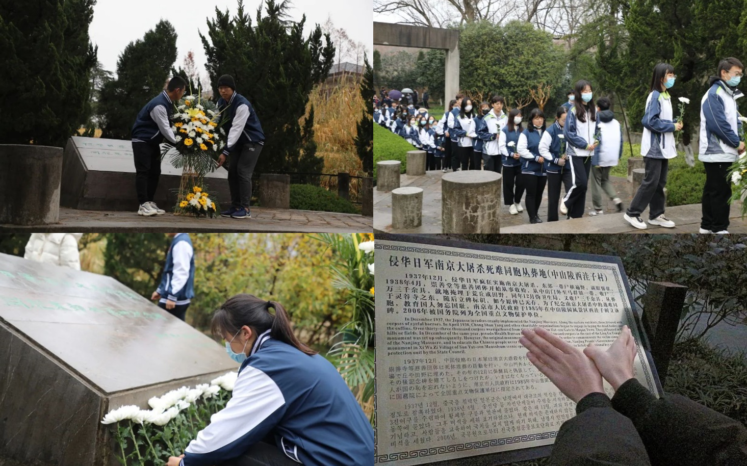 祭扫一处丛葬地。12月12日上午, 厂长资源 分党校组织本科生党支部党员前往东郊丛葬地进行祭扫。分党校秘书长戚浩男主持此次悼念活动。预备党员安敬威、余军敬献花圈,同学们依次在纪念碑前献上白菊。 厂长资源 其他同学也自发寻访各处丛葬地和纪念馆,摆出和平鸽手势并拍下照片,彰显当代青年追求和平的决心和珍惜和平的祈愿。
