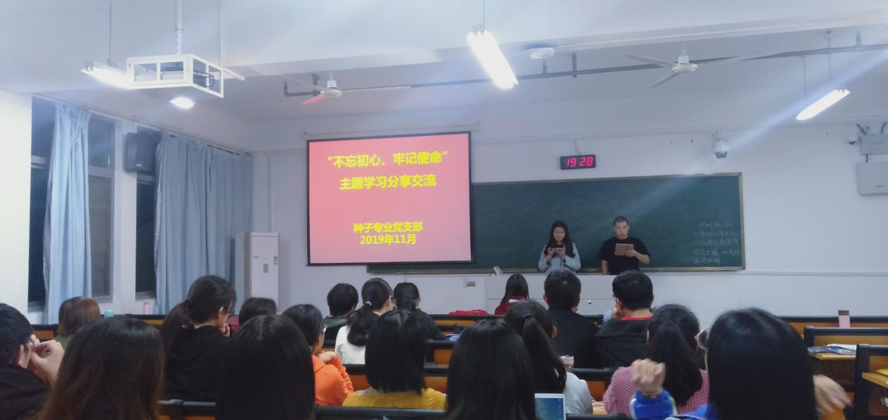 2019年11月23日, 厂长资源 种子专业党支部于教四楼B204召开支部书记关于“不忘初心、牢记使命”学习心得分享交流大会,种子专业党支部全体党员参加,会议由支部书记马艳琴主持。