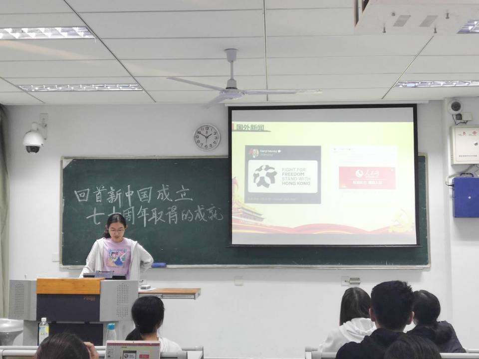 2019年10月25日,植物实验专业党支部于主楼209开展了以“回首新中国成立70周年取得的成就”为主题的分班讨论。本次讨论主要分为四个部分,分别是影片片段观摩、以“继往开来,砥砺前行”为主题的成就分享、国内国外新闻速递和知识竞赛,回首新中国成立七十年来的峥嵘岁月。由支部宣传委员雷源同学主持本次分班讨论。