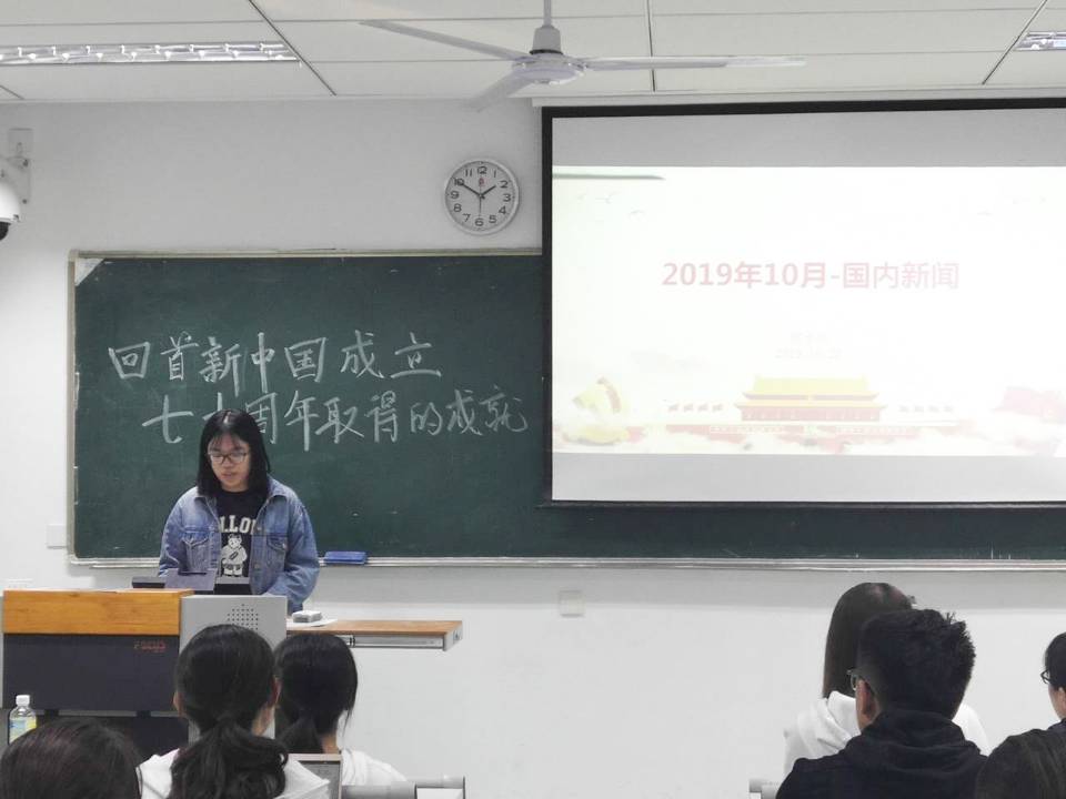 第三部分是由康敏、贺子欣同学带来的国内、国外新闻分享。贺子欣同学从国庆阅兵,国庆期间旅游消费再创新高等方面为我们介绍了十月的丰富多彩;由康敏同学制作、赵智同学播报的国际新闻,包含了韩国日本贸易战等外国资讯,开拓了我们的眼界,丰富我们对世界的认识。
