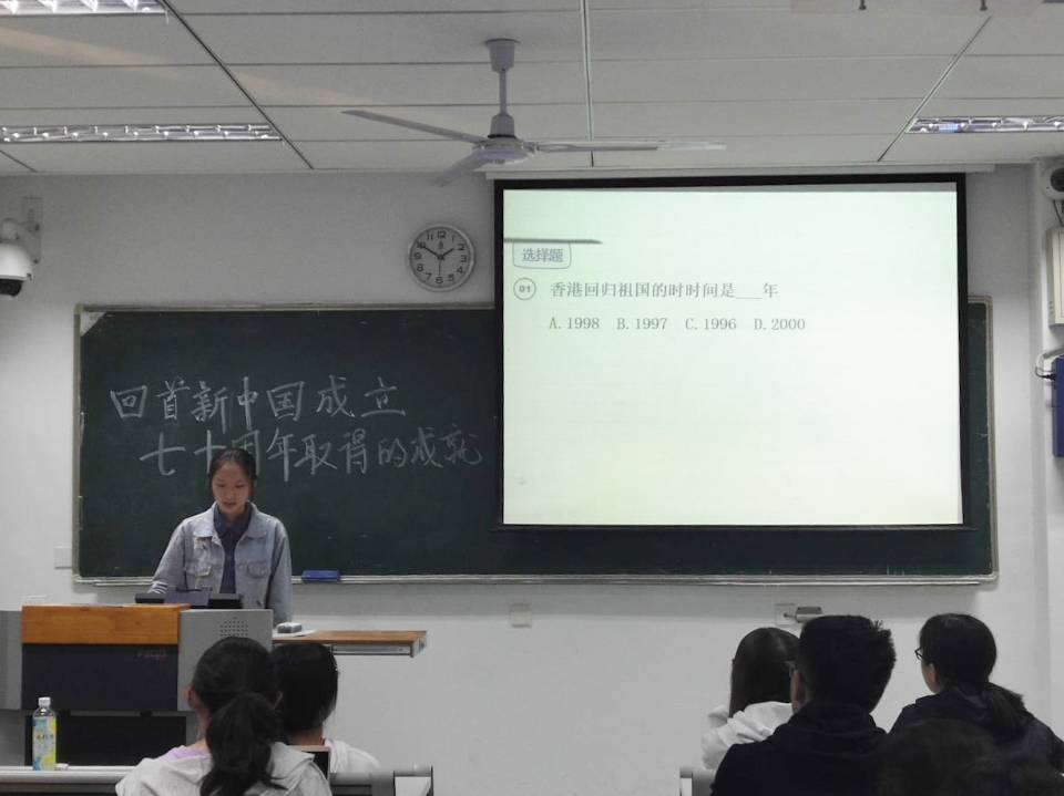 第四部分是由马舒洋同学主持的知识竞赛环节,同学们积极回答问题,俞佳宁同学谈及新中国成立70周年以来政治、文化方面的感受。