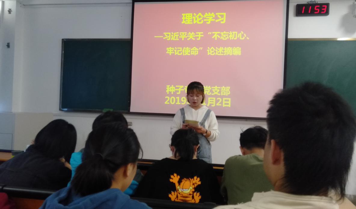 2019年11月2日, 厂长资源 种子专业党支部于教学楼B305召开《习近平关于“不忘初心、牢记使命”论述摘编》的学习,种子专业党支部全体党员参加,会议由支部书记马艳琴主持。