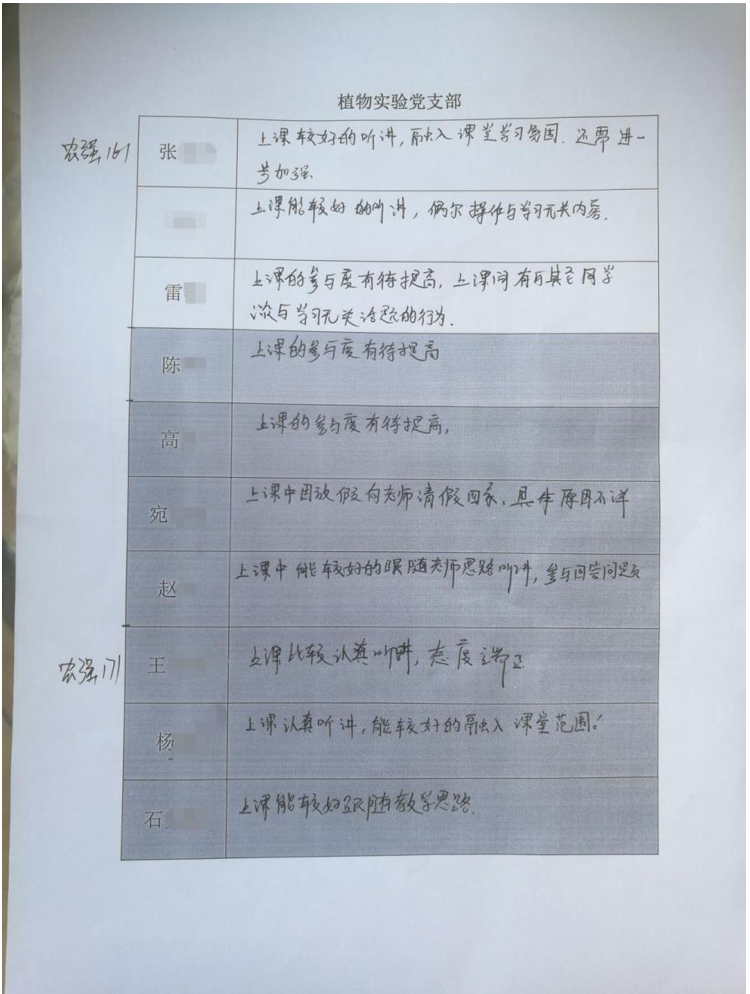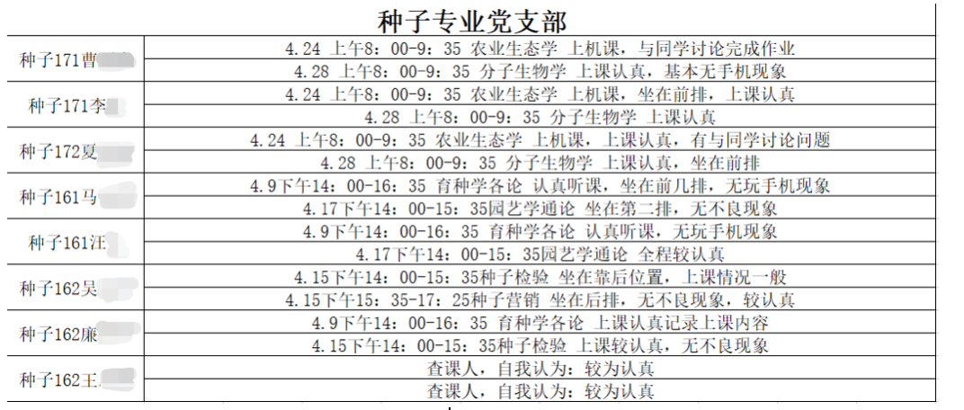 此次活动结果反映良好,在四小组的查课记录单上,大部分学生党员每次上课基本都会坐在教室前排,认真听老师授课。有个别党员偶尔玩手机,注意力不集中,通过在党员群里强调之后,也都积极改正,认真听讲。