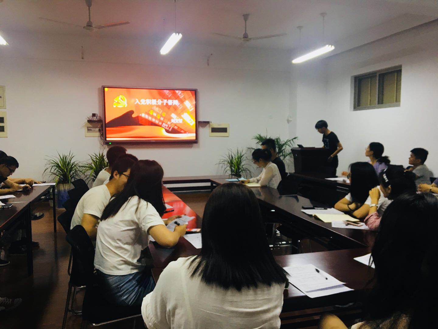 首先积极分子与预备党员竞选者通过PPT从思想、学习、活动、入党动机以及自身不足等方面进行了详细的汇报。大多数同学思想方面有不错的进步,积极向党组织靠拢,在学习和科研方面表现的表现较好。但也存在一部分同学思想深度以及行动力还有所欠缺,需要更进一步的考察。经过投票,推选出张佳、安璐为拟发展对象,李庆、夏小云、杨宗锋为积极分子候选人。预备党员与积极分子也进行了半年考核汇报。