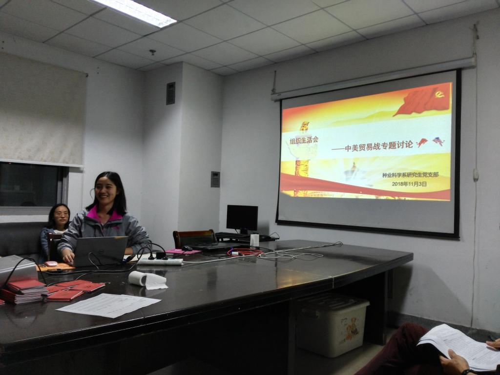 2018年11月3日,种业科学系研究生党支部在理科楼D701召开10月份组织生活会,由副书记兼组织委员李梦雅同志主持,主题为“中美贸易摩擦了解与专题讨论”。会议开始李梦雅同志首先简要介绍了中美贸易战的基本内容,然后针对这一话题,提出了以下三个问题供同学们讨论:一,贸易战将会对我们的生活由那些影响;二,贸易战对于即将踏入社会的学生党员带来何种启示;三,身为农学研究生的我们面对贸易战能做些什么。参会同志们分组进行了热烈的讨论,并由各组代表朱沛文、程浩、范运新等同志主动发言表明讨论结果,最后李梦雅同志总结发言。