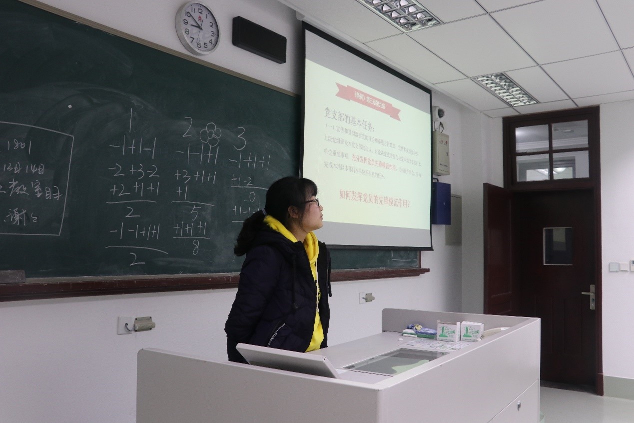 而后,为在支部内弘扬理论联系实际的优良学风,预备党员雷源将条例中“密切联系群众”、“筑牢学生理想信念根基”等高校党支部要求与支部成员的生活相联系,引起支部成员讨论的热情,鼓励大家学以致用,知行合一。