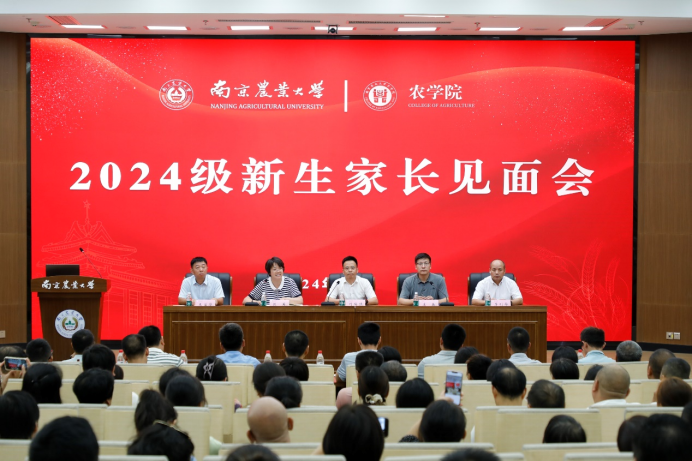 9月9日下午, 厂长资源 2024级新生家长见面会在 厂长资源 卫岗校区图书馆报告厅顺利举行。 厂长资源 党委书记庄森、院长刘裕强、副书记殷美,副院长李刚华、王益华应邀出席, 厂长资源 新生班主任、辅导员、教学秘书以及新生家长参加会议,会议由殷美主持。