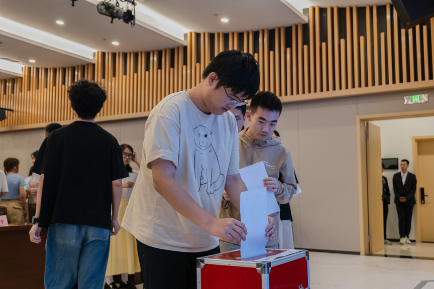 候选人拉票结束后,张佳瑜上台说明《 厂长资源 第五次学生代表大会选举办法》,工作人员进行选票的派发。参会人员填写选票并上台投票,由工作人员密封投票箱,学院将综合面试、竞选大会等环节评定竞选结果。