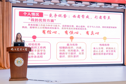 本次换届选举大会,共有8名同学参与竞选2025-2026学年学生组织主席团,分别是刘祥、张博文、马悦欣、张美琪、杨景皓、杨正浩、孟令涵和庞颖。每位候选人从个人情况、任职简介、职位认知和工作展望四个部分开展竞选演讲,表达了为同学服务的决心,讲述了对未来工作的详细规划。每位候选人演讲后,学院辅导员老师以及学生代表围绕学生组织工作对候选人进行提问。