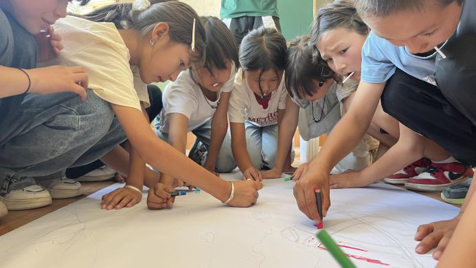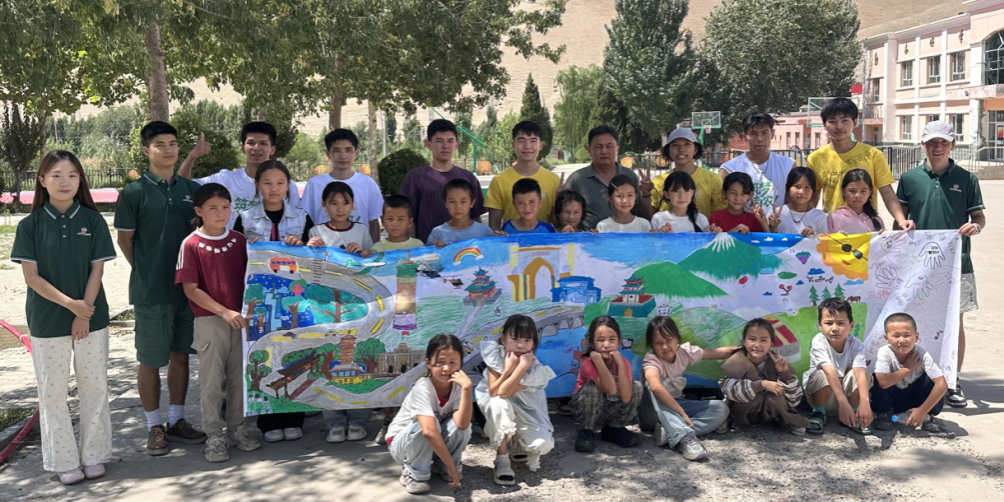 实践团随后组织开展了以“宁伊农情”为主题的绘画课程。课程通过展示南京夫子庙、秦淮河、新街口等标志性街景图片,引导学生感受城市风貌;继而呈现新疆伊宁特色建筑、集市场景等画面,唤起学生对家乡的认知。在实践团成员指导下,学生们分组创作主题为“宁伊农情街景”的绘画作品。创作完成后,孩子们用普通话自信介绍各自画作,表达了对家乡风貌的理解与热爱。