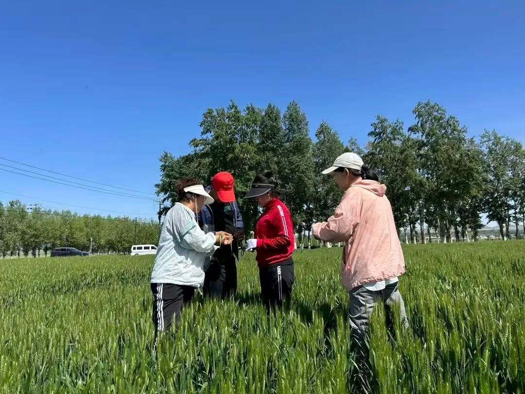 麦浪翻滚,如一片浩瀚的大海。实践团成员深入这片 “海洋” ,开展小麦种植调研,成员们穿梭在麦田间,裤脚沾满了泥土,额头上渗着汗珠,专注却丝毫未减。指尖轻触饱满麦穗,目光细致扫过株株小麦,手中的记录本上,株高、分蘖数、穗粒数等数据被一一认真记录。他们细致排查可能存在的病虫害迹象,评估土壤的墒情与肥力,并与田间劳作的村民交流,在田间一线学习种植经验,也记录下村民们遇到的难题。每一份记录,都是热忱的见证,也为后续的技术指导提供了详实依据。