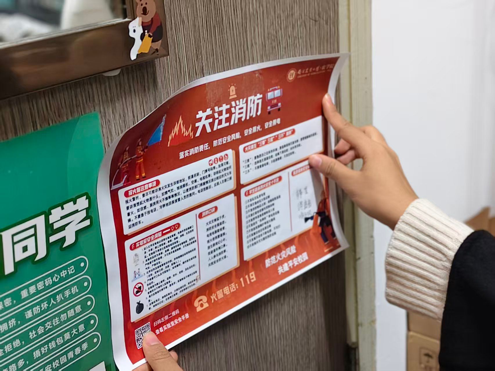 此外,我们还精心设计了消防安全宣传海报,走进宿舍为同学们科普防火要点与逃生技能。同学们积极响应,纷纷在宣传海报上签名承诺,并将其张贴于宿舍门后等醒目位置,让安全意识抬眼可见、驻留心间。