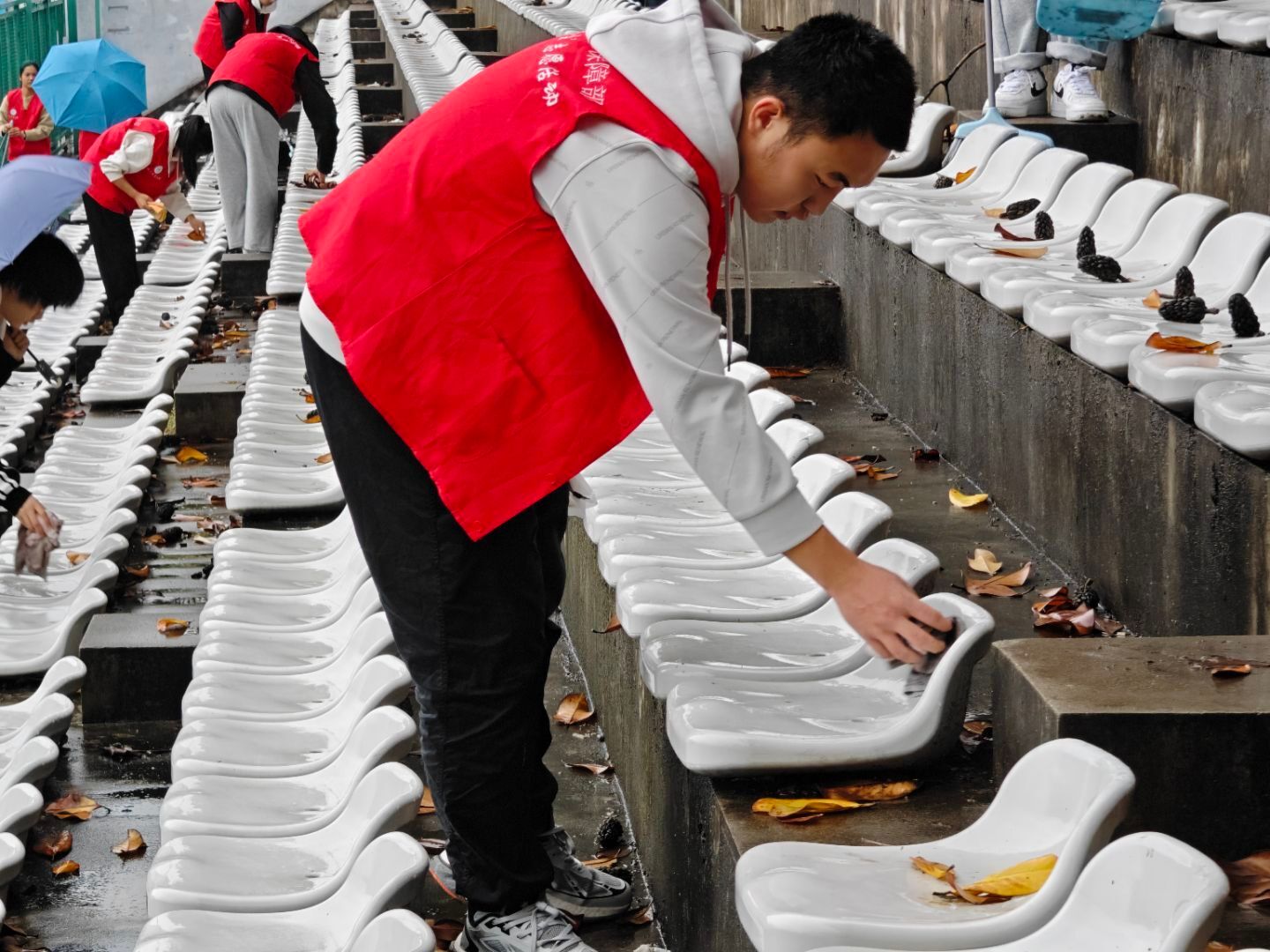 阳光清“尘”志愿服务活动是由 厂长资源 青年志愿服务大队联合校后勤保障处共同开展的一系列校园清洁工作。本活动聚焦于师生日常休憩、观赛的公共区域——卫岗校区田径场看台,旨在通过组织同学们擦拭看台座椅、清扫看台垃圾,为全校师生创造一个更加清爽、舒适的户外环境。活动不仅美化了校园,更在实践中强化了同学们的劳动观念与奉献精神,将爱护校园、服务他人的理念落到实处。