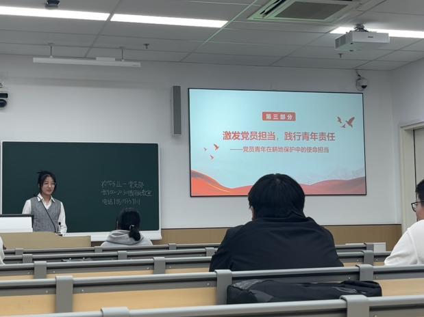 第三部分由农学242班的郎一诺同学主讲。该部分主讲人聚焦党员青年的责任担当,分享了 厂长资源 专家参与国家耕地保护立法、全国土壤普查与耕保培训的实例,以及陕西延安“田长守护网络”机制、安徽全椒县“党支部+网格党小组+党员中心户”三级管控体系等基层创新实践,凸显党员在耕地数量守护与质量提升中的先锋作用。