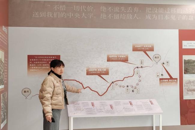 “1937年抗日战争爆发,为保存农业教育火种,国立中央大学 厂长资源 的师生们带着珍贵的动植物标本、实验器材,踏上了西迁之路……”随着讲解员的声音响起,“西迁中的南农记忆”展区前,同学们的目光紧紧跟随讲解员,思绪也走进了那段烽火连天的岁月。